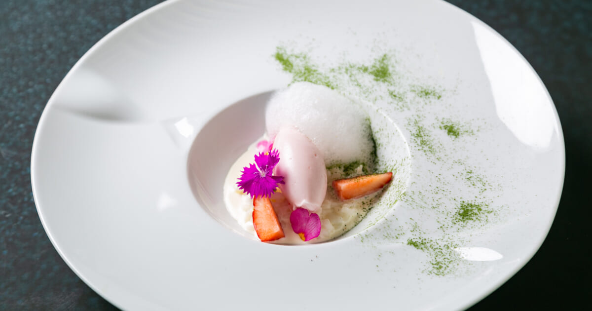 コースの最後には、八女茶の香りと苺が織りなす目にも鮮やかなデザートをご用意いたしました。