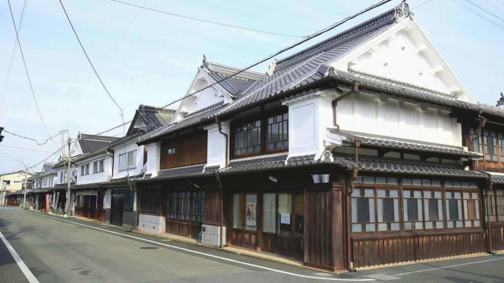 雛人形の生産地として知られる八女ならではの風景として、白壁の町並みの家々や商店に
