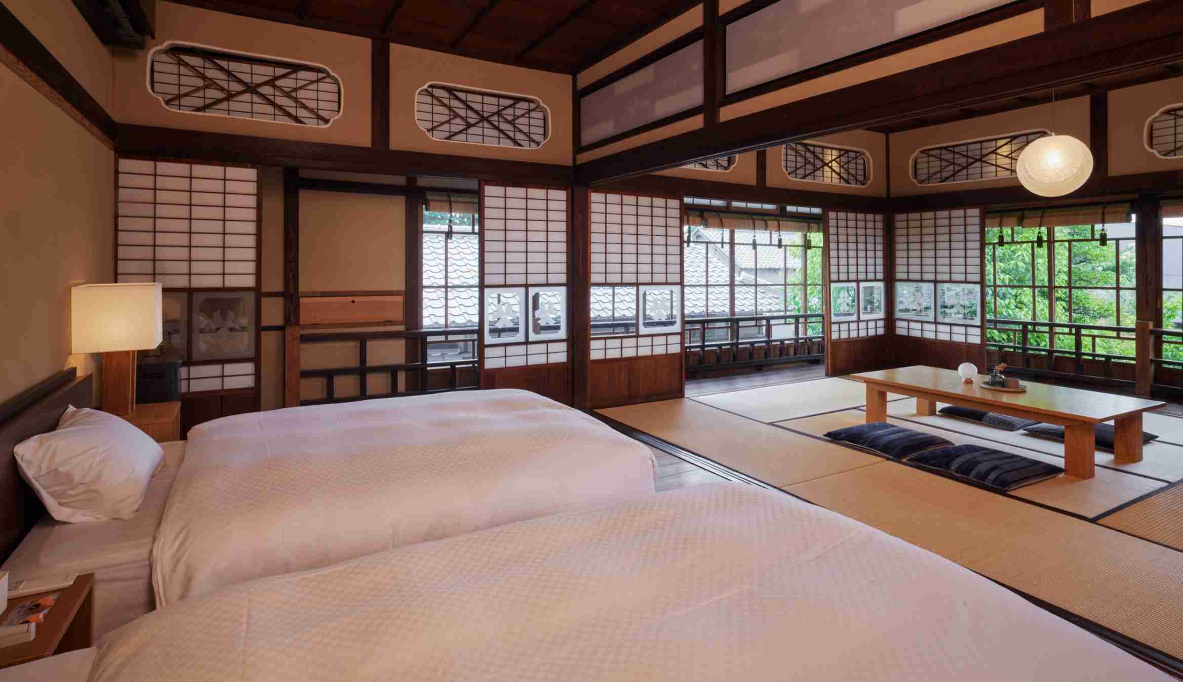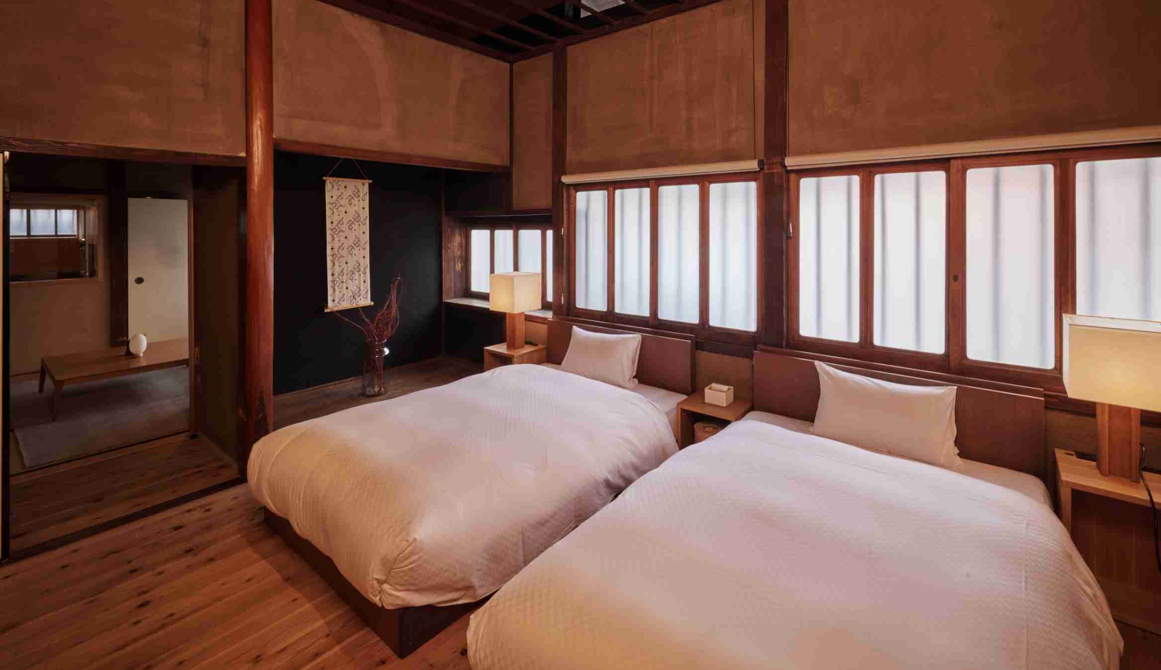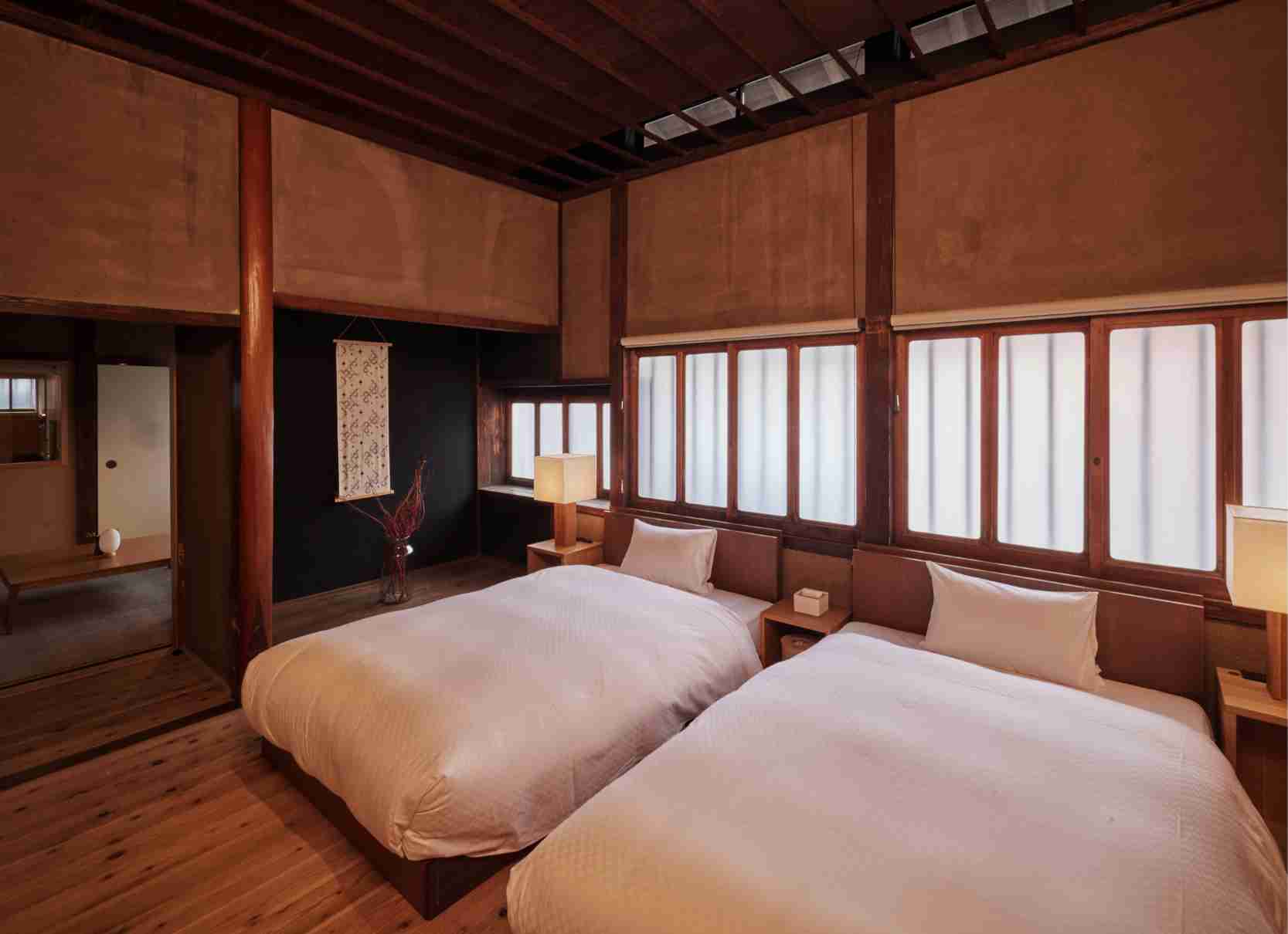 山紫水明の地「八女」に創業して約200年を迎える老舗蔵元のひとつ「喜多屋」。当時の窓枠やガラス、梁はなるべくそのままに修繕をし、フロントとレストラン機能を備えた3室の客室として生まれ変わりました。併設のバーでは、蔵元・喜多屋の日本酒や本格焼酎を楽しむことが出来ます。