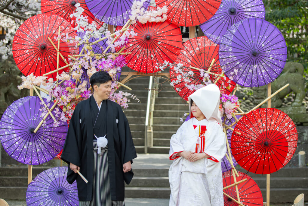 神社が設えた桜の装飾も相まって、まるでこの日を祝福するかのような美しい光景の中で、神前式が厳かに執り行われました。