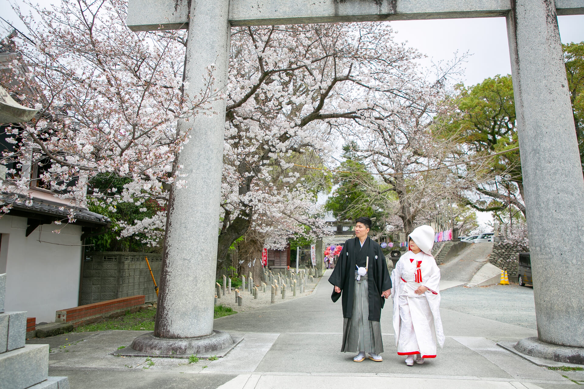おふたりの地元 八女。神前式の舞台となったのは、八女の人々に長く親しまれている福島八幡宮。
